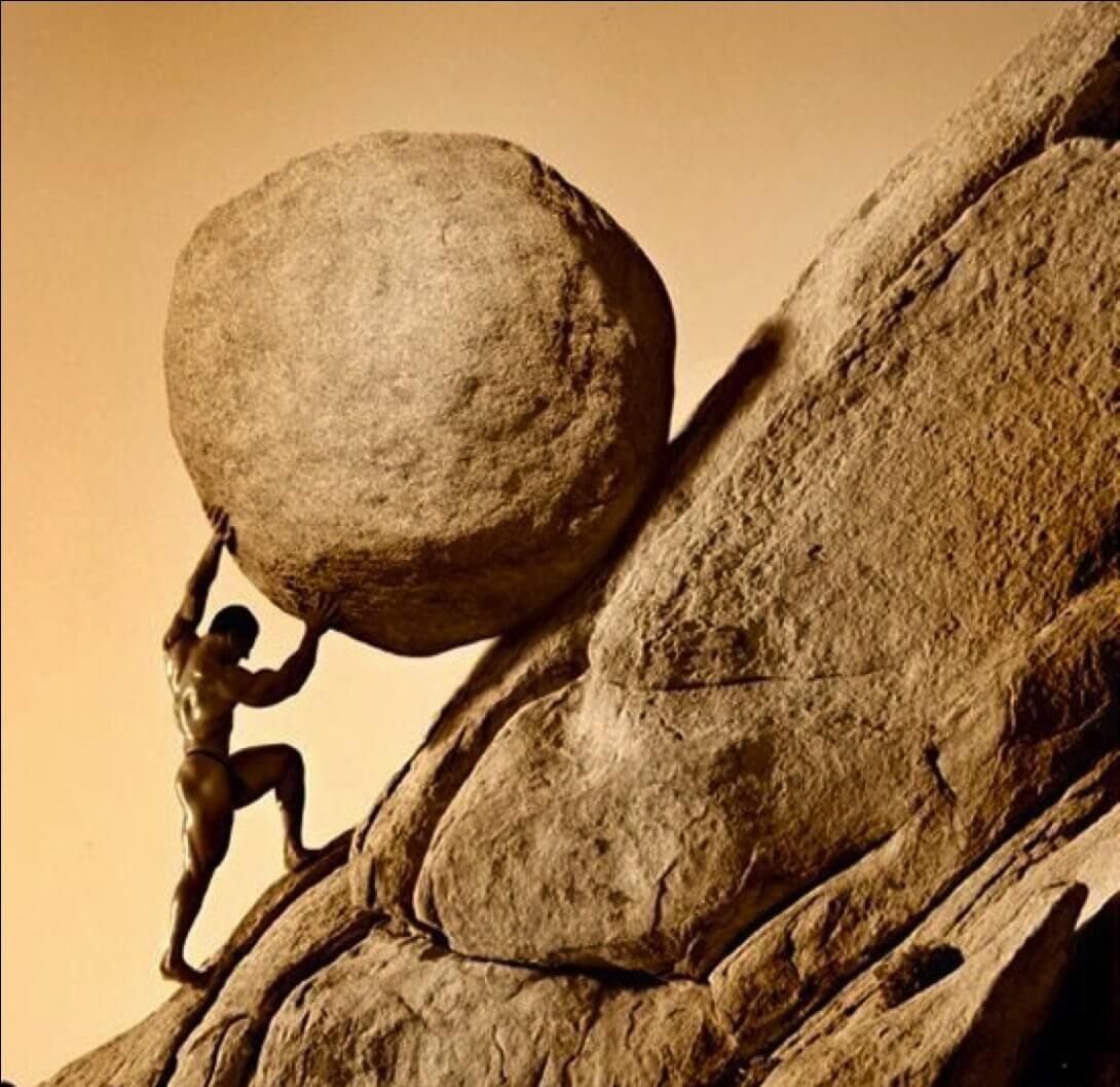 Denemede; bir kral olan Sisifos, Yunan Mitolojisine göre tanrılar tarafından sonsuza kadar sürecek bir cezaya çarptırılıyor. Büyük bir kayayı, bir dağın en yüksek tepesine çıkarmakla cezalandırılan Sisifos, zirveye her vardığında taşın tekrar aşağı yuvarlanması gerçeği ile yüz yüze kalıyor ve bitmek tükenmek bilmeyen bir kısır döngünün içine giriyor. Her defasında taşı tekrar zirveye çıkarıyor. İşte Albert Camus’ye göre bu döngüyü trajik yapan da Sisifos’un her deneyişinde tekrar düşeceğini bile bile taşı çıkarmaktan yılmaması oluyor.