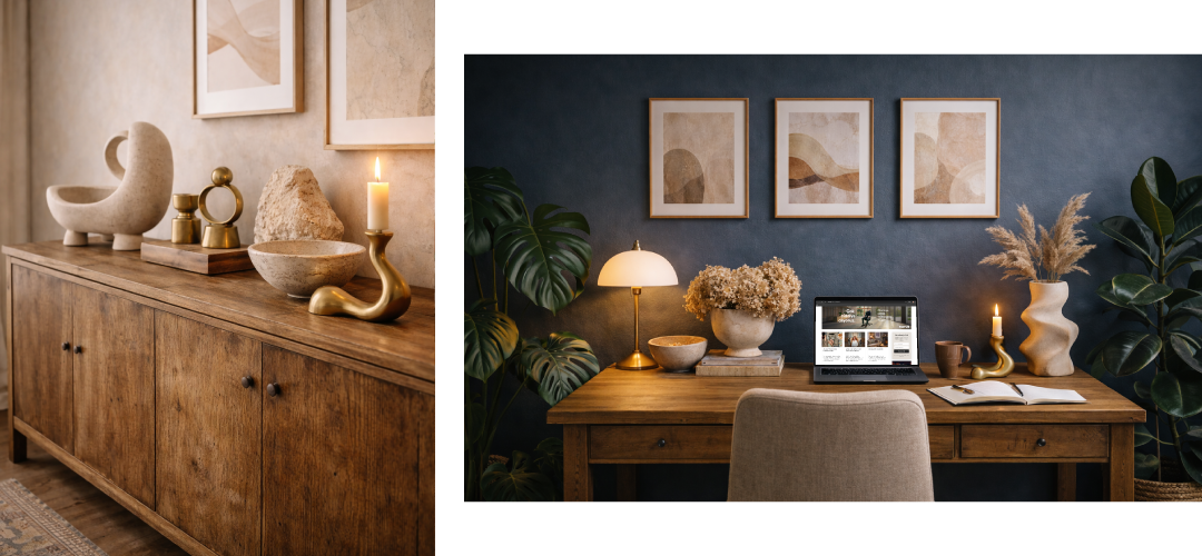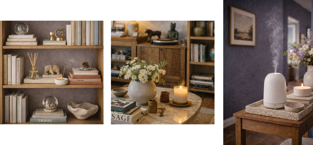 Bu yaklaşımda raflar, sehpalar ve konsollar küçük sergi alanlarına dönüşüyor. Bir sehpanın üzerinde büyük bir kitap, onun yanında dokulu seramik vazo, yanında minik bir biblo ve sıcak tonlu bir mumluk… Amaç, her köşede göze hoş gelen küçük kompozisyonlar kurmak.