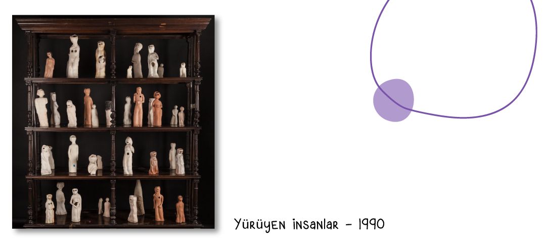 Yürüyen İnsanlar – 1990: Füreya’nın en ikonik eserlerinden biri pişmiş toprak heykelciklerden oluşan Yürüyen İnsanlar. Gözleme önem veren sanatçı sokakta boş gözlerle bakan, yaşam amacı olmayan, duygusuz insanlar görünce bunu sanatına aktarıyor; beyinsiz, midesiz ve yüzlerinde gözleri olmayan insanlar üretiyor. Ferit Edgü’nün bu eseri görünce “karamsar” bulduğunu biliyoruz. Fakat Füreya Koral’dan gelen cevap çok net: Artık ben de karamsarım. Füreya artık yeni işler üretemediğini düşünerek, artık üretmemeye karar veriyor.